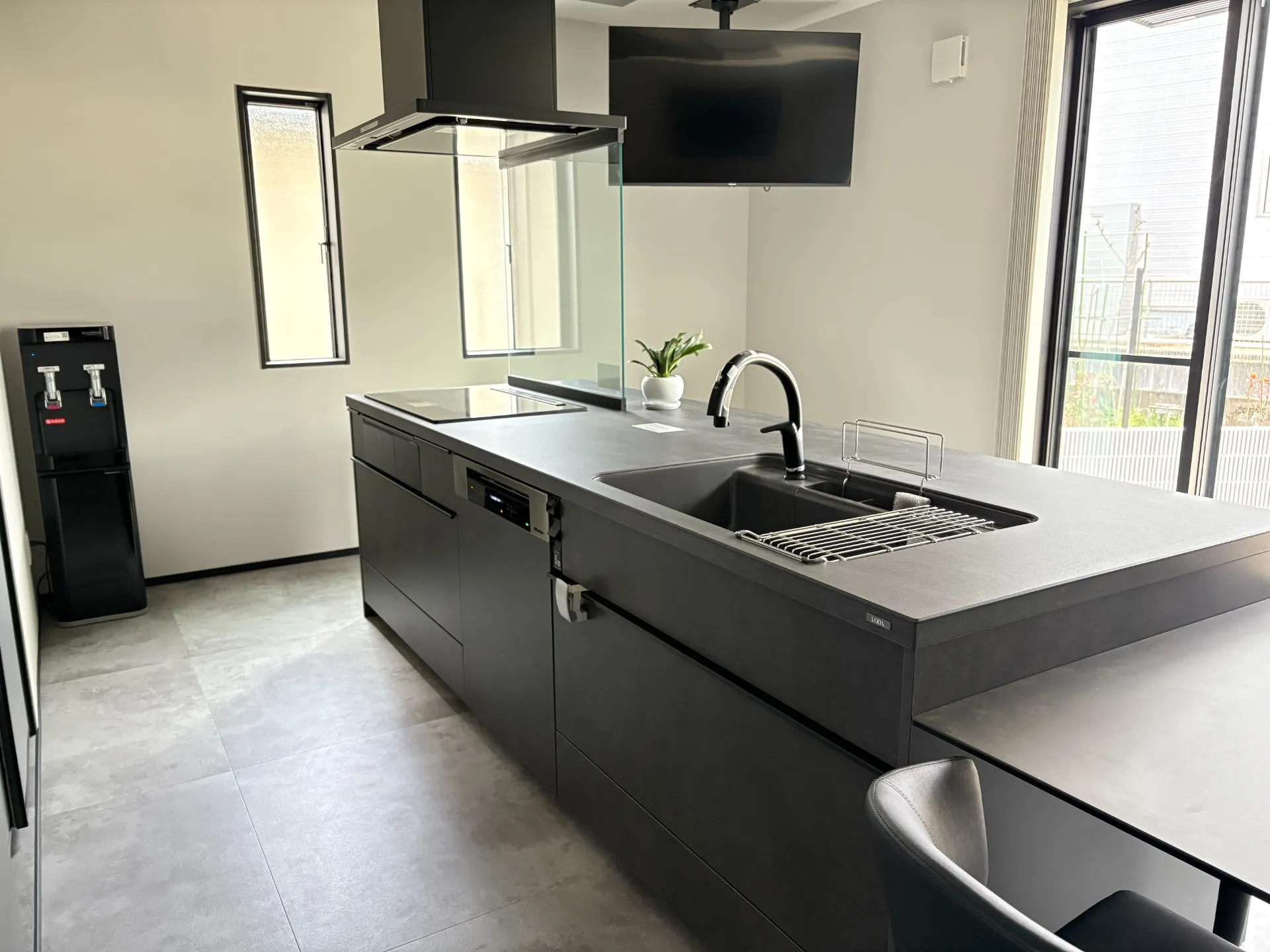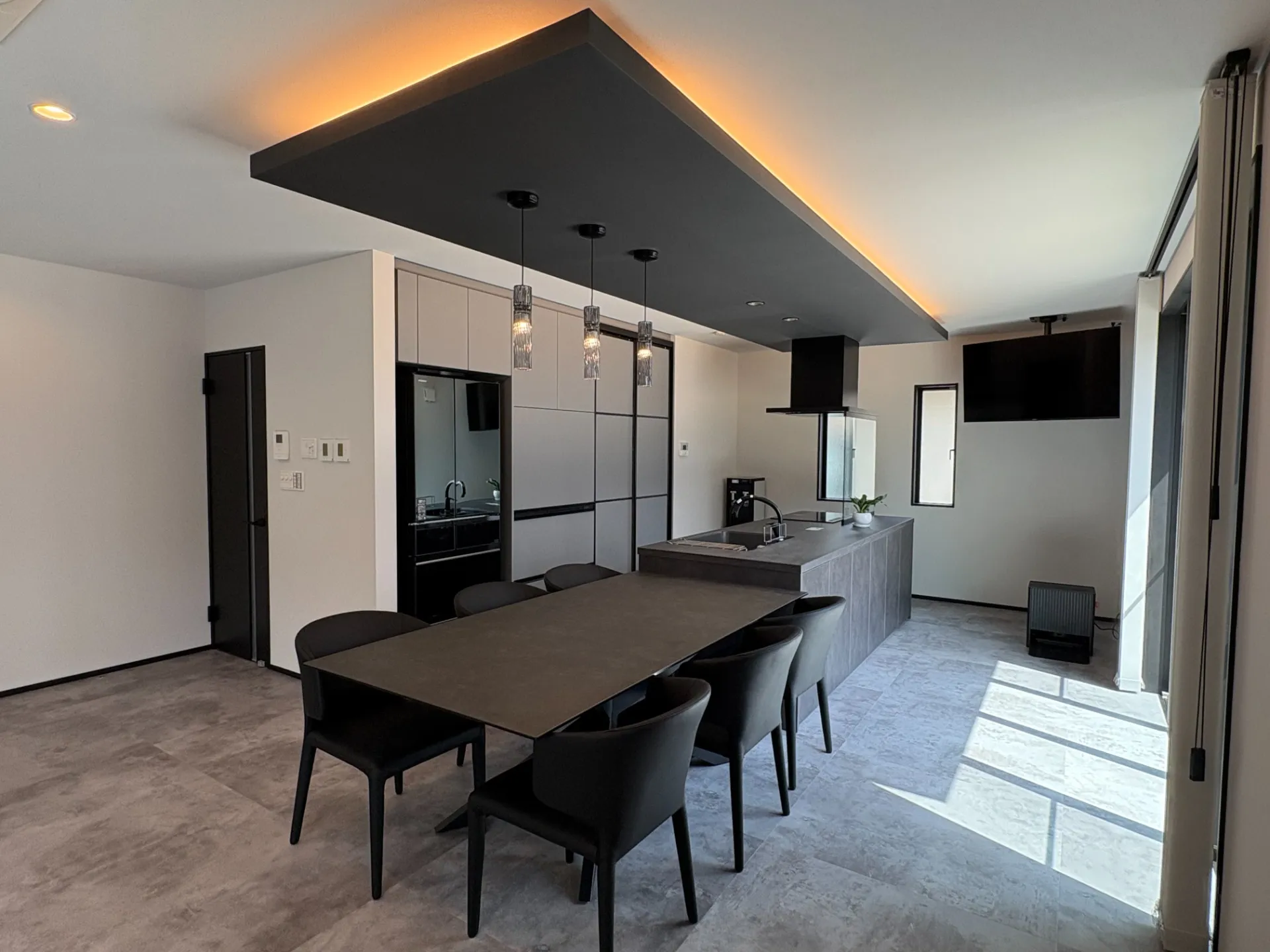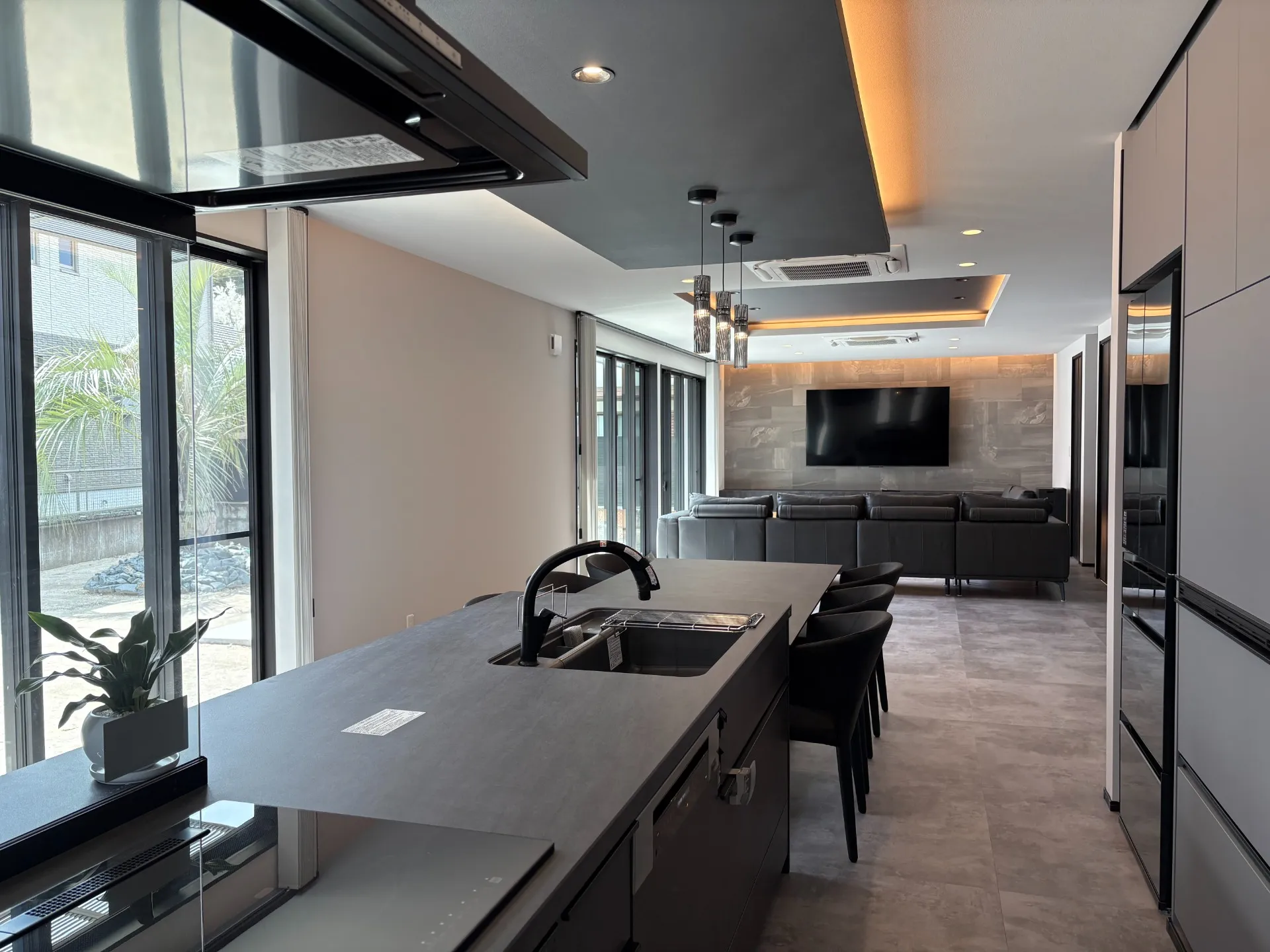 セラミックトップのセンターキッチンにダイニングテーブルをつなげて配置