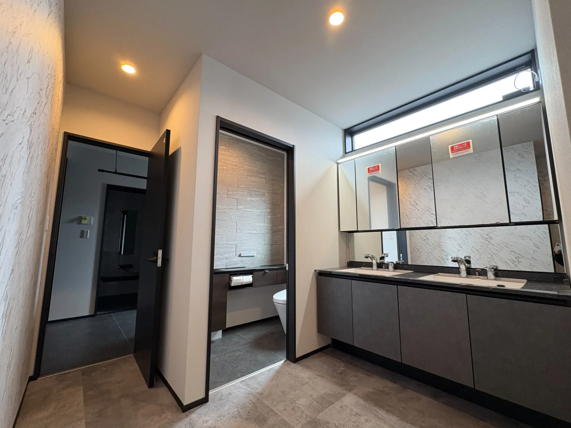 洗面台は2ボウル式で廊下に配置。奥の扉が脱衣室 LIXIL ルミシスを採用
